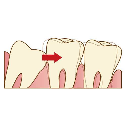 また、上だけ、もしくは下だけ親知らずが生えている場合は、噛み合わせを探して挺出(歯が伸びてくる動き)することがあり、手前の第2大臼歯(7番目の歯)に負担をかけてしまうこともあります。